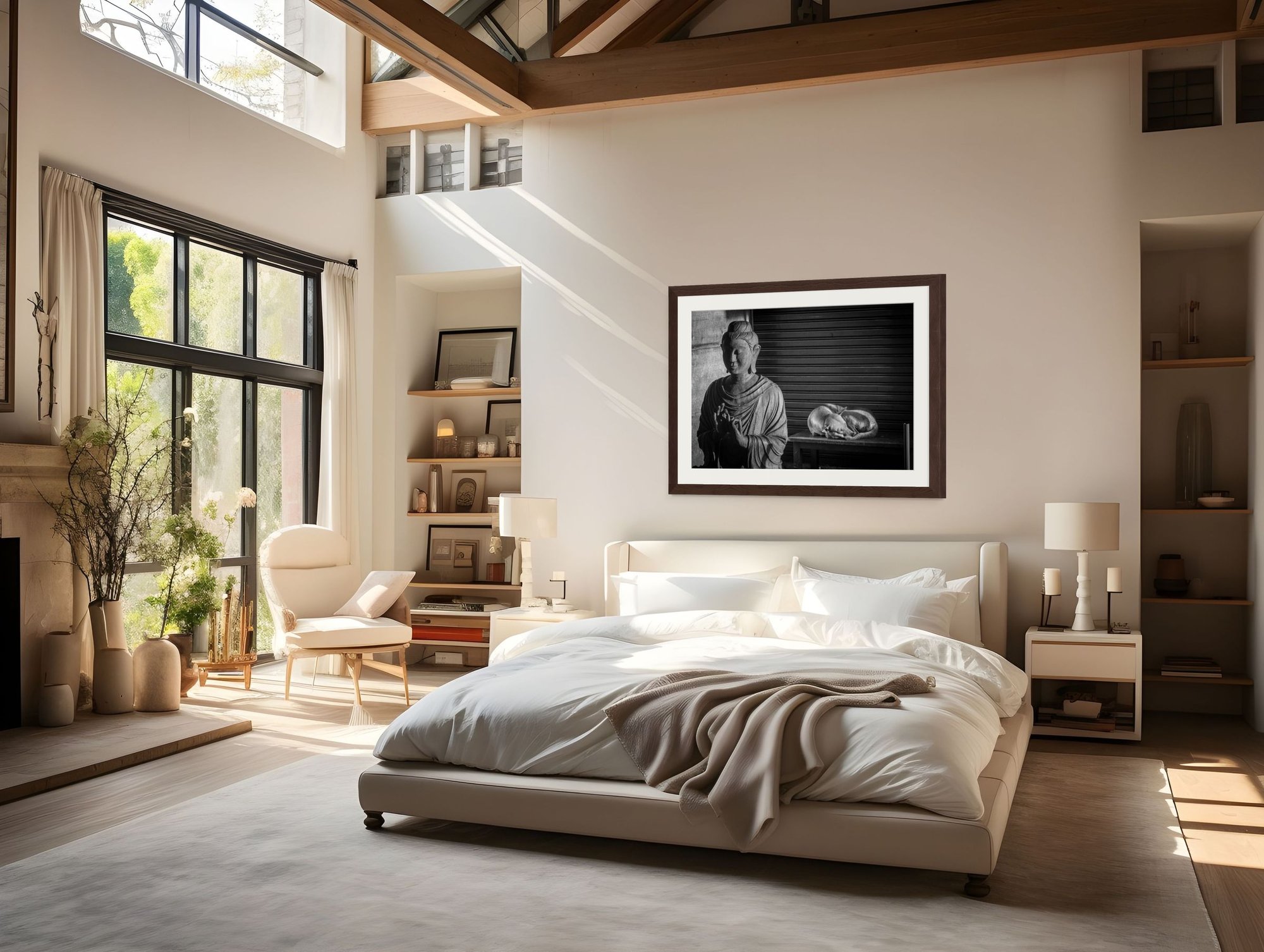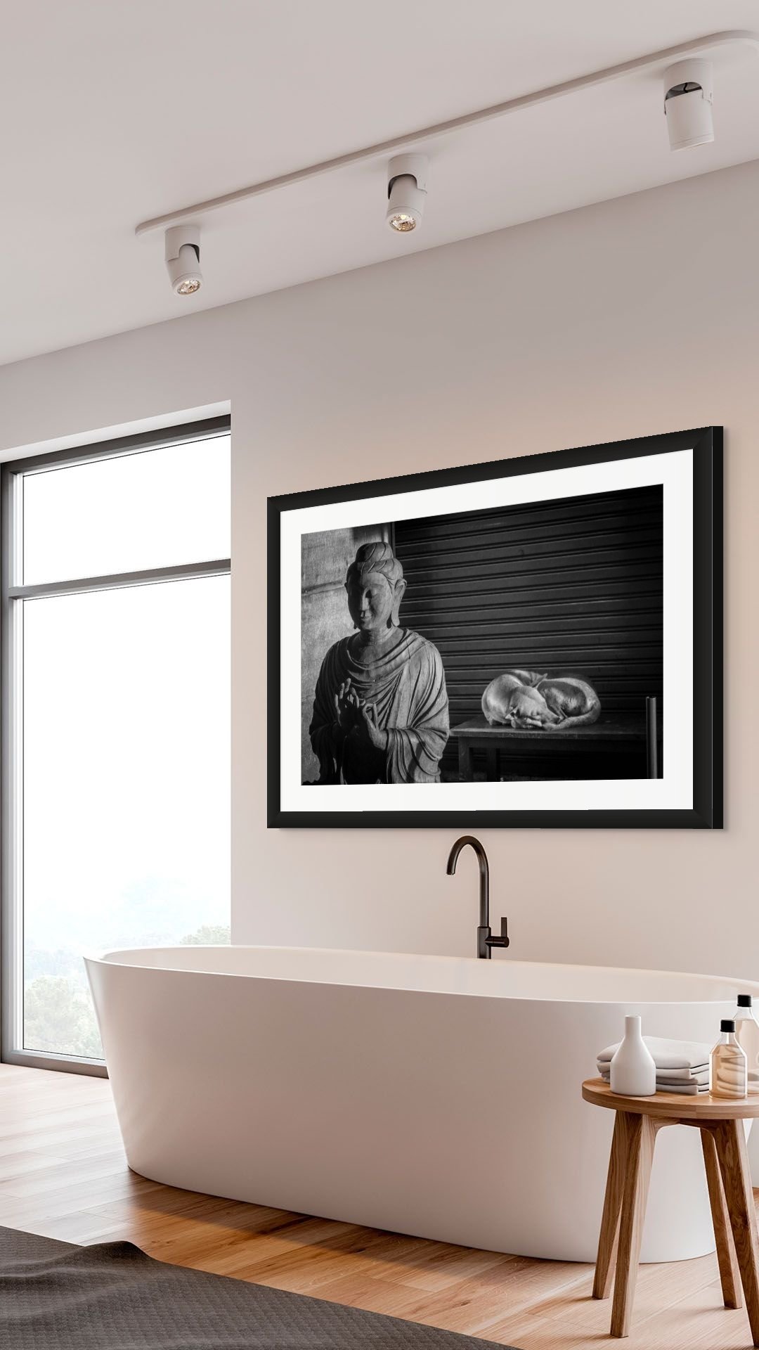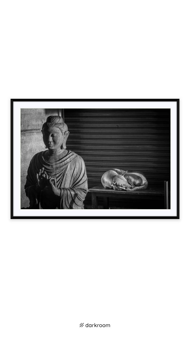 Early light on a wooden Buddha and a street dog curled at its side—sacred calm meeting everyday rest. I was drawn to the way the forms echo each other: the weight of the statue, the oval of the dog, the soft fall of light stitching them together. In black and white the textures take the lead—carved robe, shutter slats, fur—and the scene settles into a gentle balance. It’s a photograph about grace without ceremony, the kind of shared stillness you find when a city first wakes. From distance it reads serene and simple; up close it’s rich with surface and tone. After purchase, you’ll receive a digitally signed Certificate of Authenticity. Editions / Prices: 24×36 (Ed.15) $900 · 30×45 (Ed.10) $1,450 · 40×60 (Ed.5) $2,200